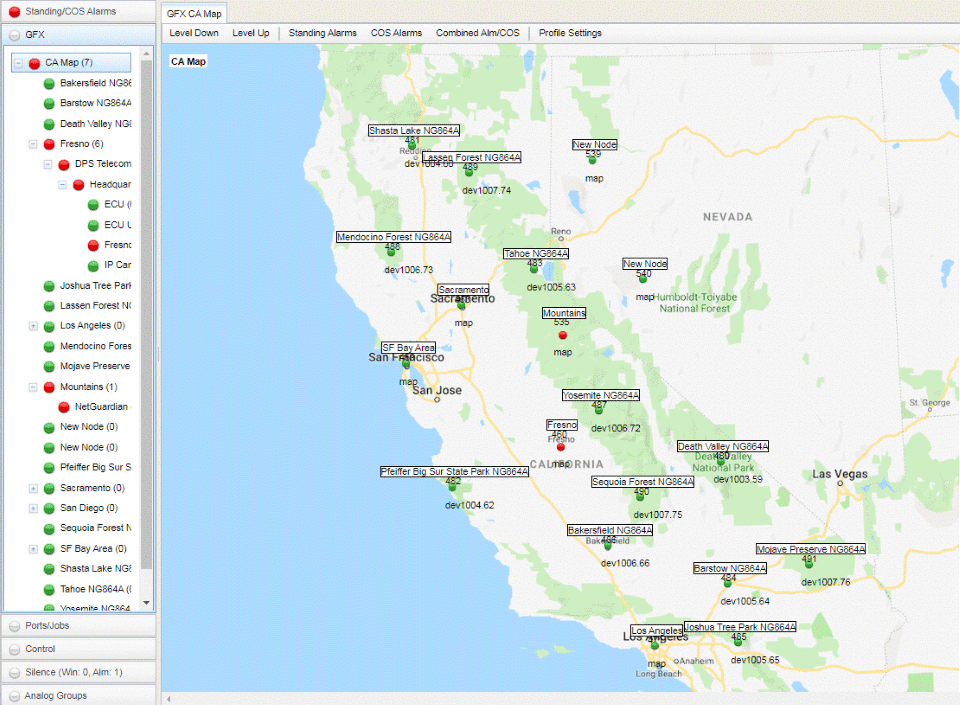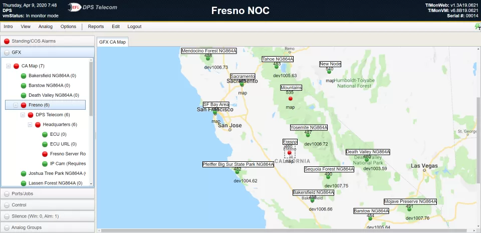 • T/Mon GFX graphical user interface shows all alarms on layered geographic maps in real-time.